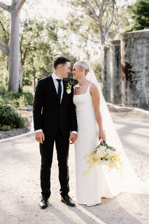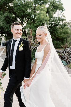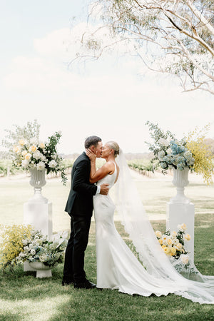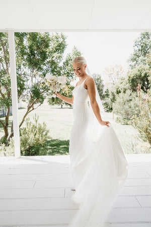 Lilly wears our She's Unmissable gown with our In Full Bloom veil and dress bow.
