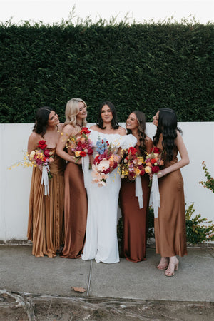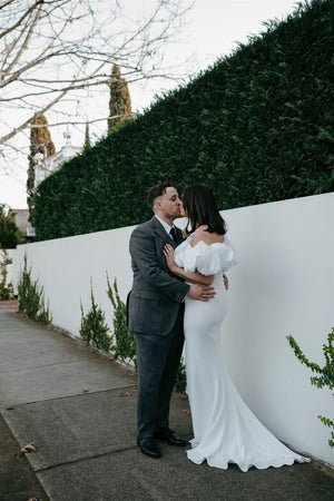 Maya wears our In The Clouds gown with our Girl Crush sleeves and shoulder band.