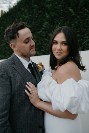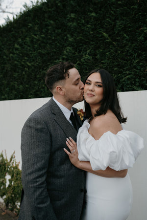Maya wore the one gown with two looks thanks to custom detachable sleeves. She wore the elegant long sleeves from 'Girl Crush' for her ceremony, and the playful 'In The Clouds' shoulder band come her reception. Paired with straight hair and natural glam makeup, her look was incredibly stylish and effortlessly cool.