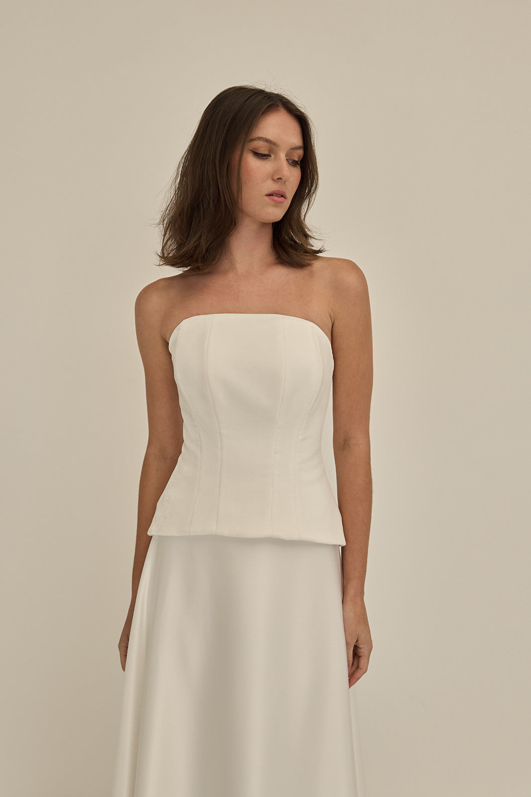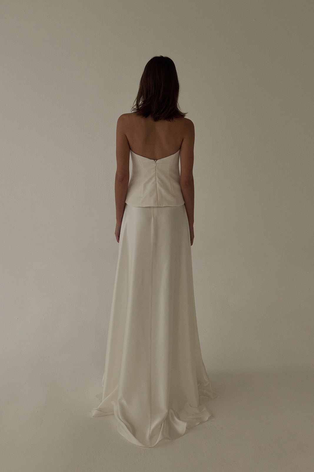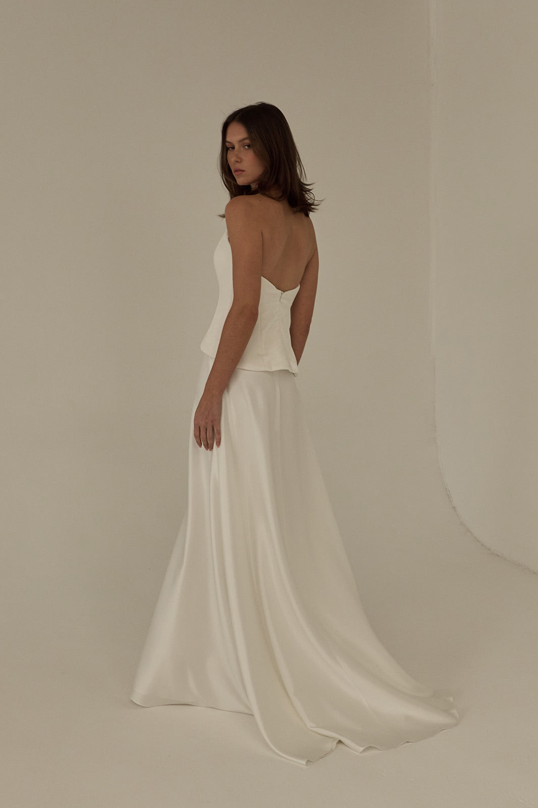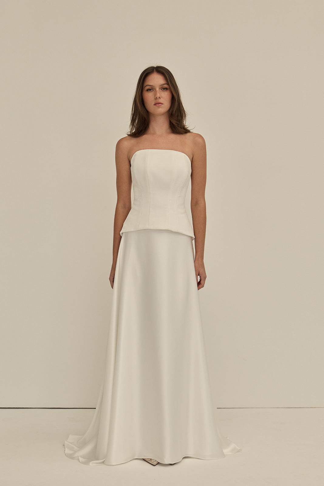 The Camellia Gown is a modern two-piece silhouette that pairs structure with softness. The strapless velvet corset bodice is precisely tailored to sculpt and define, while the fluid A-line skirt falls with effortless movement and quiet elegance. Together, they create a look that is contemporary, feminine, and unmistakably refined.