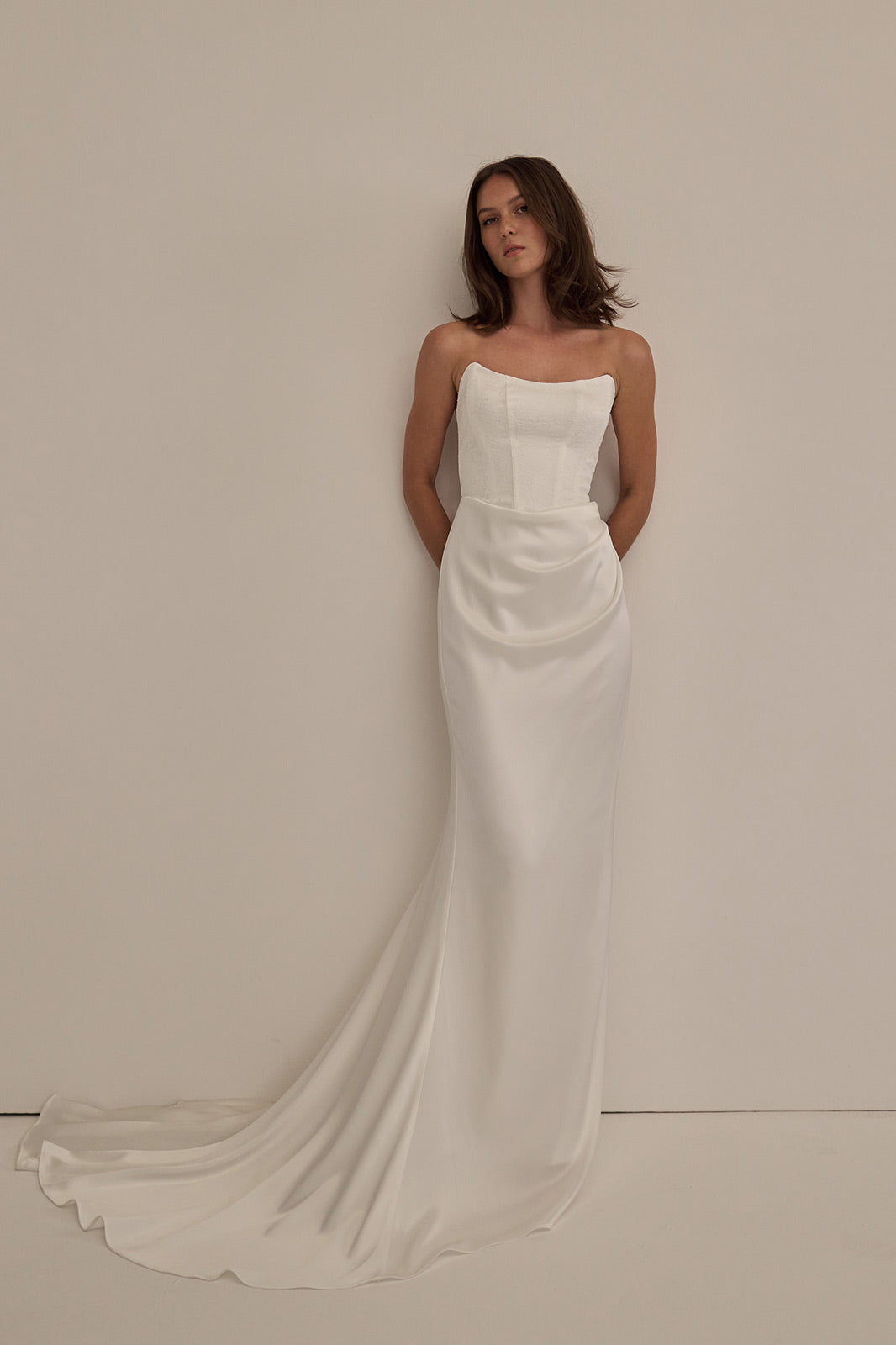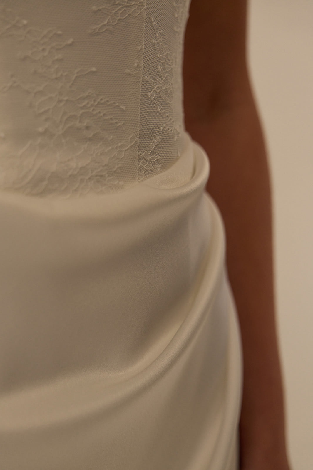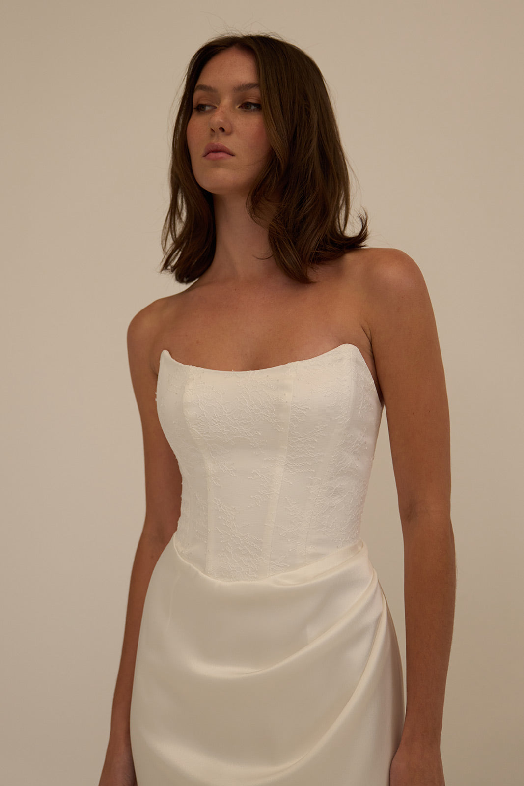 The Clover gown blends delicate texture with timeless structure. A fine lace corset bodice with a soft scoop neckline pairs with a double satin skirt, cut in a fit-and-flat silhouette that skims the body before extending into a low back and light train. Elegant and understated, Clover is a study in modern romance.
