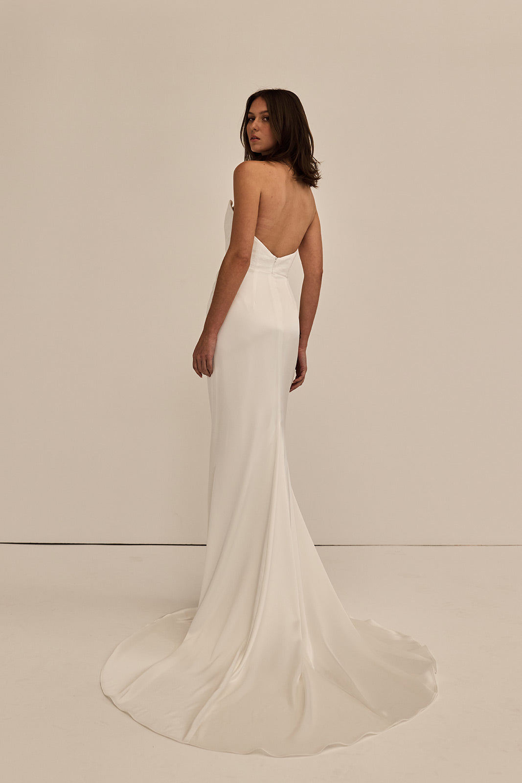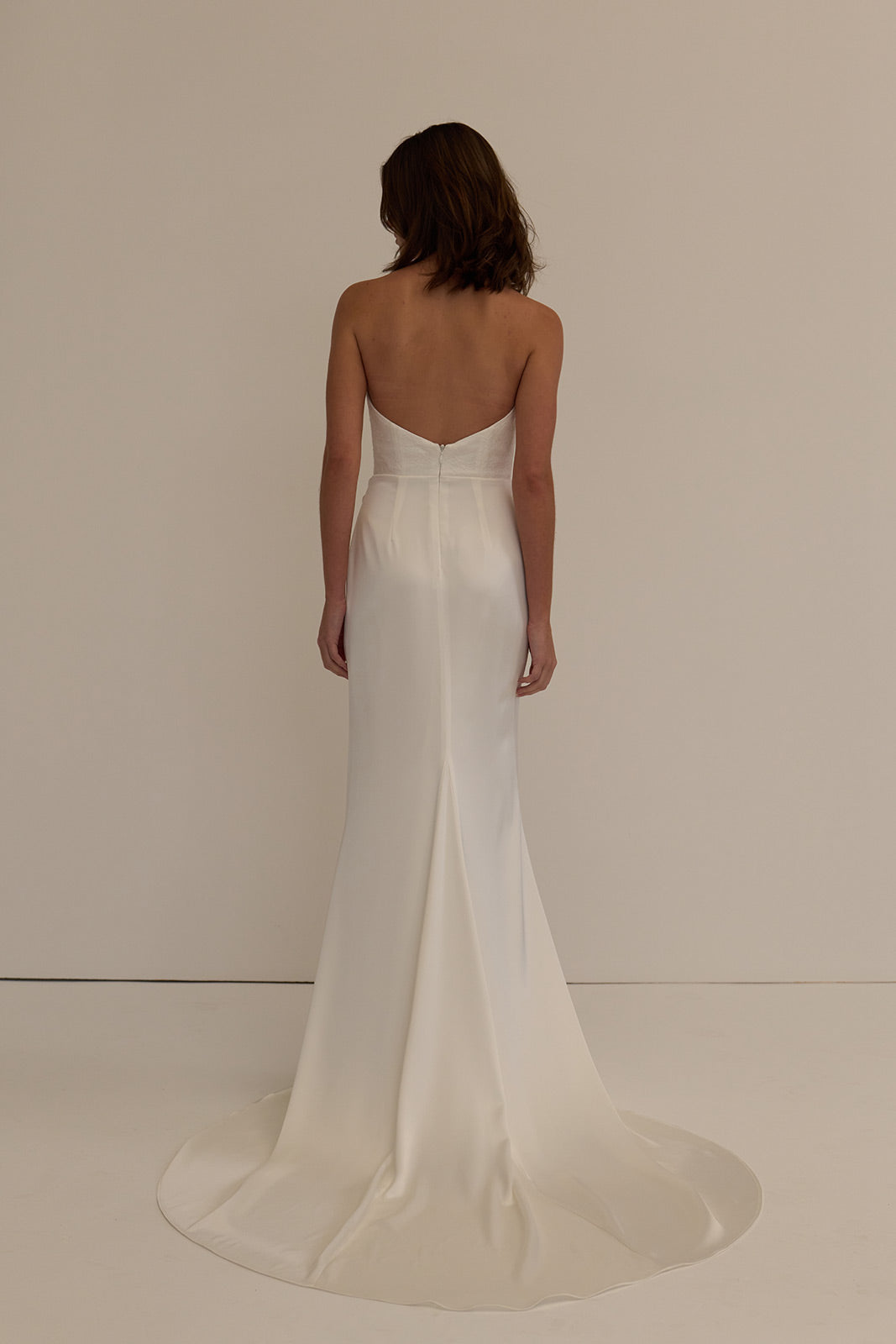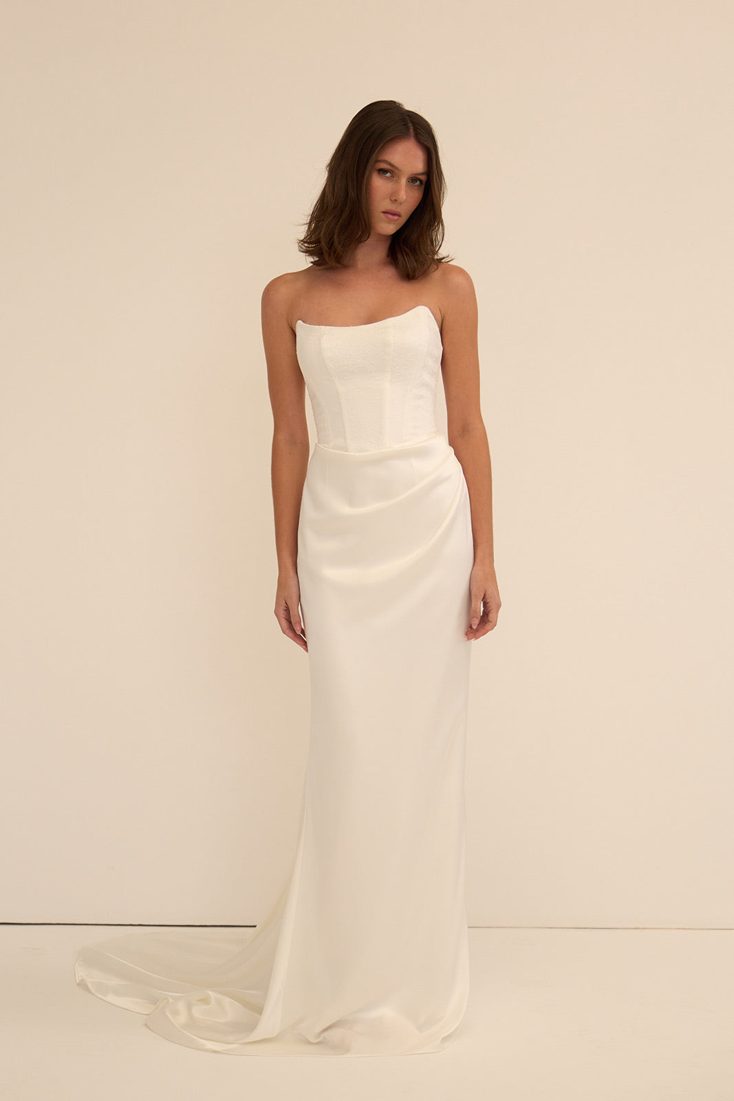 The Clover gown blends delicate texture with timeless structure. A fine lace corset bodice with a soft scoop neckline pairs with a double satin skirt, cut in a fit-and-flat silhouette that skims the body before extending into a low back and light train. Elegant and understated, Clover is a study in modern romance.