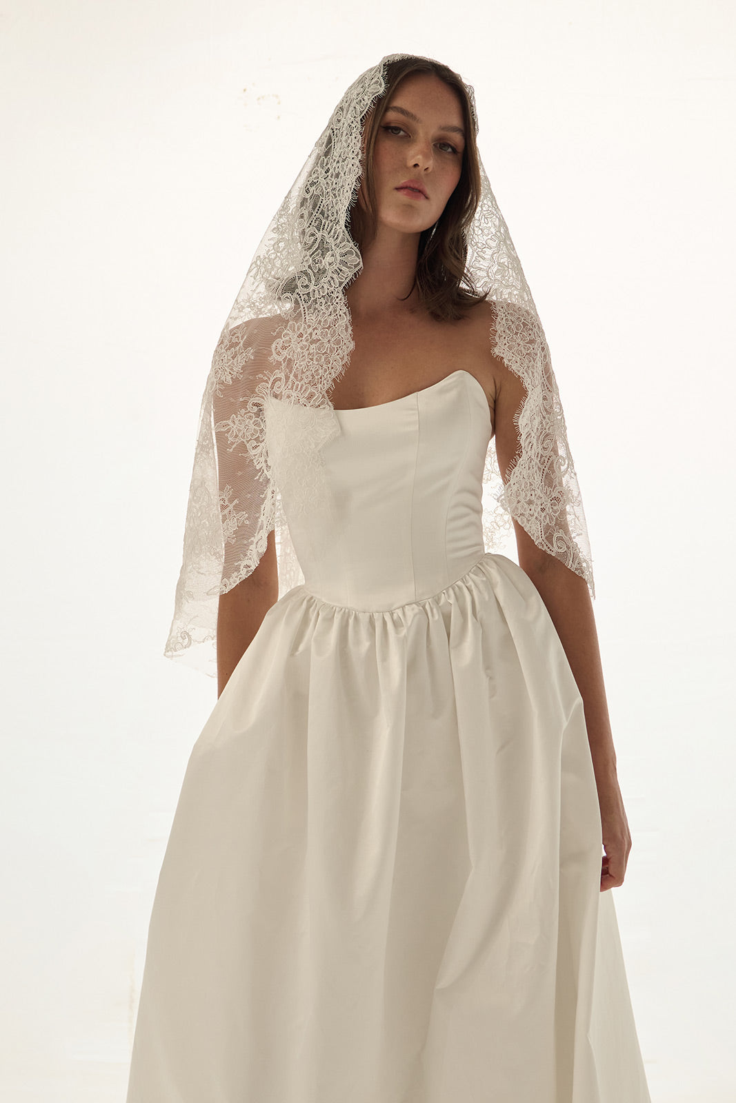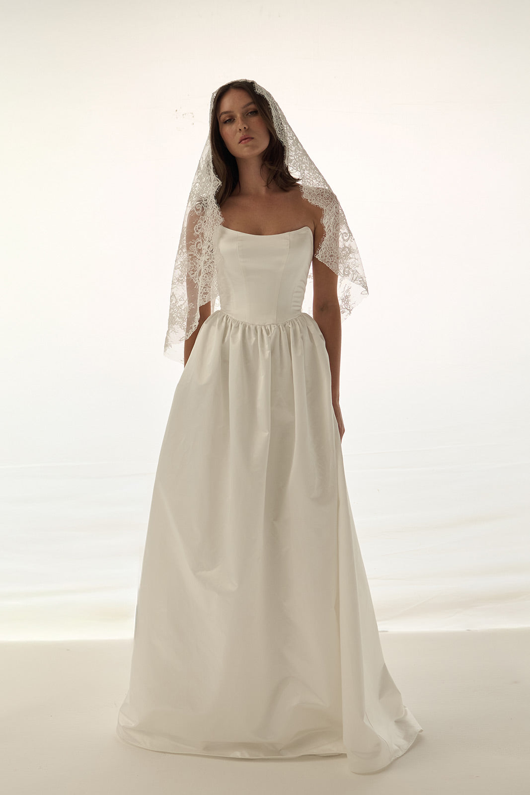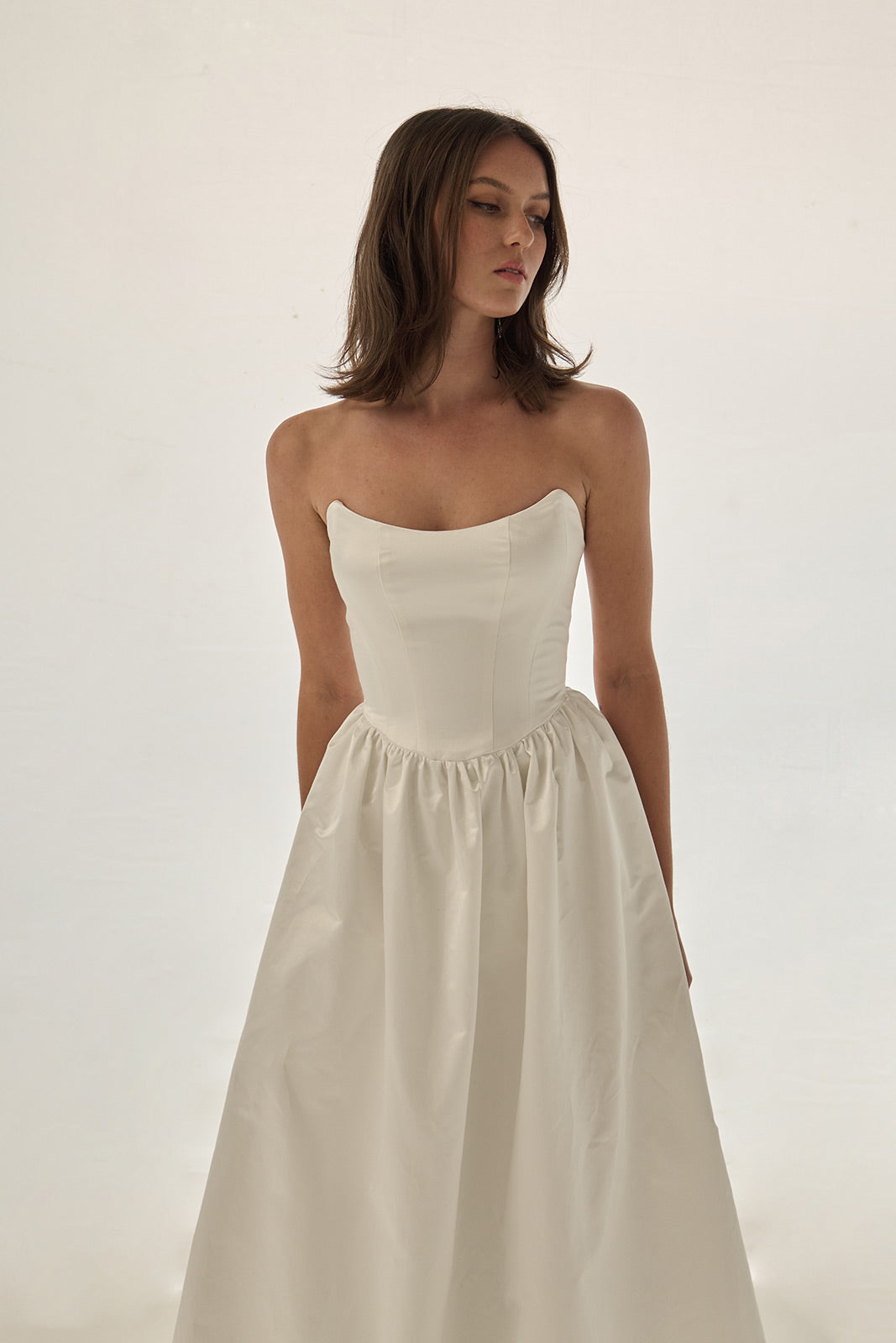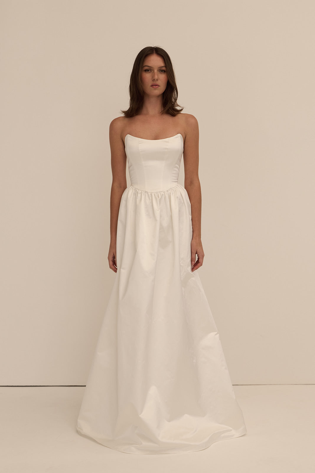 The Eden gown is a romantic, sculptural silhouette designed with refined ease. Its strapless corset bodice features a soft scoop neckline, balancing structure with delicacy. The gathered A-line skirt falls with gentle volume and finishes in a light train, creating a look that feels timeless, feminine, and effortlessly elegant.