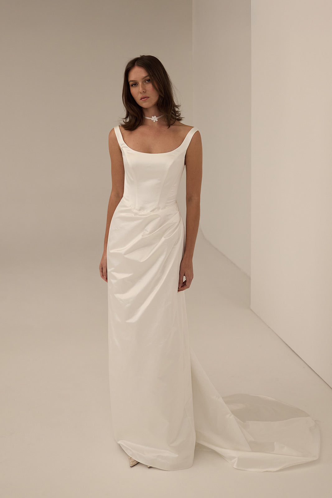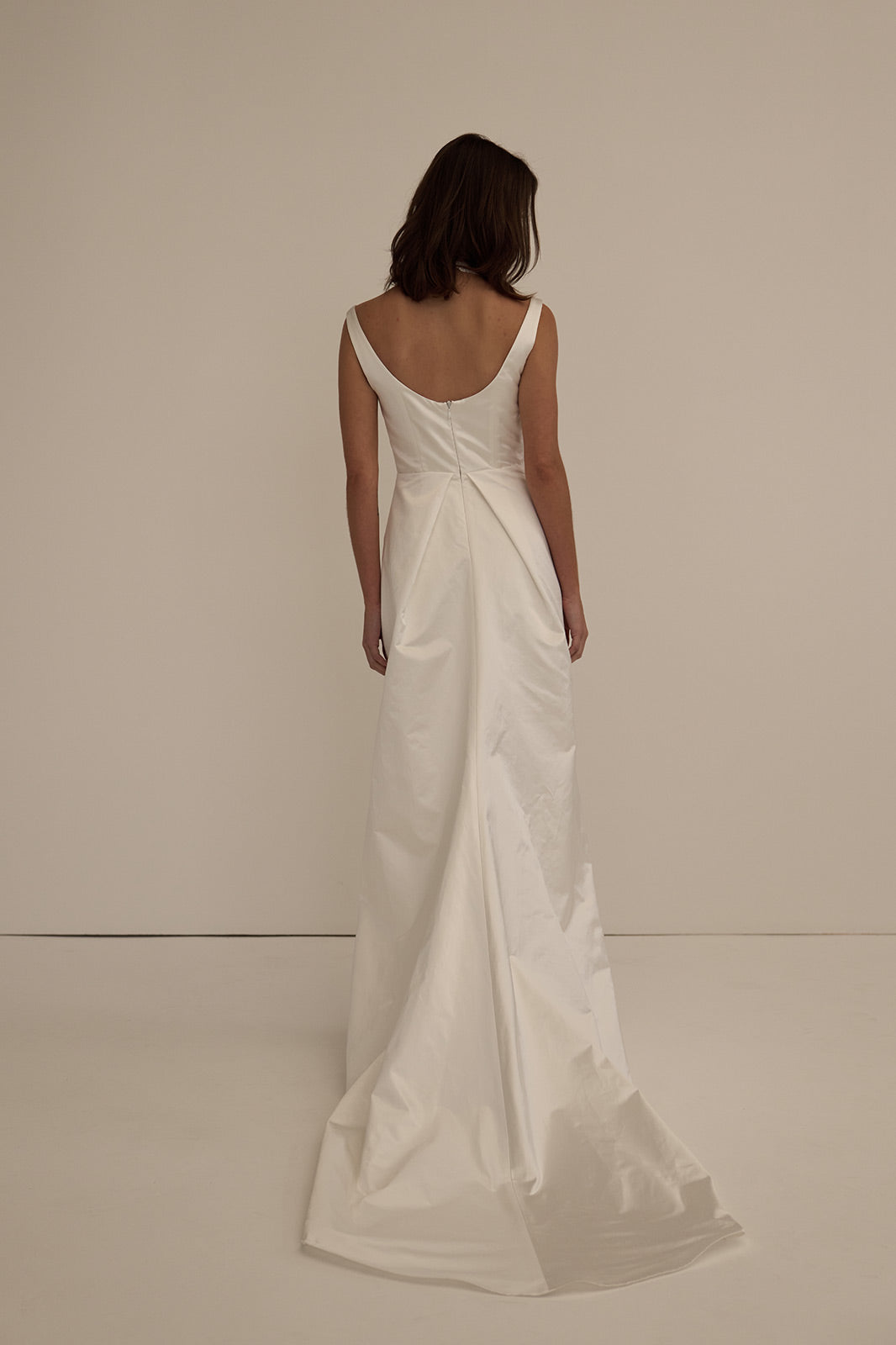 The Juniper Gown is a refined silhouette defined by clean lines and modern structure. Crafted from luminous structured silk, it features a softly scooped neckline with wide-set straps, angled bodice seams, and a dipped waist that shapes and elongates the form. The column skirt falls with quiet precision, opening into back pleats for ease of movement and a light, understated train. Understated yet striking, Juniper is a study in contemporary elegance.