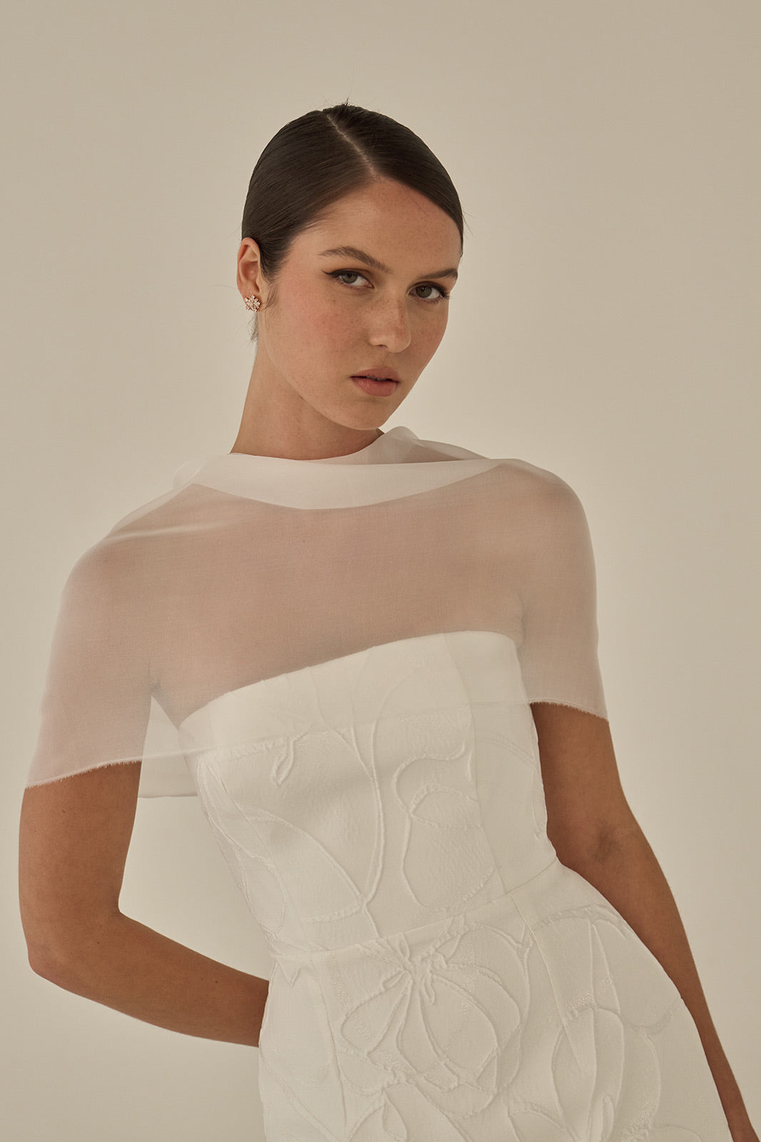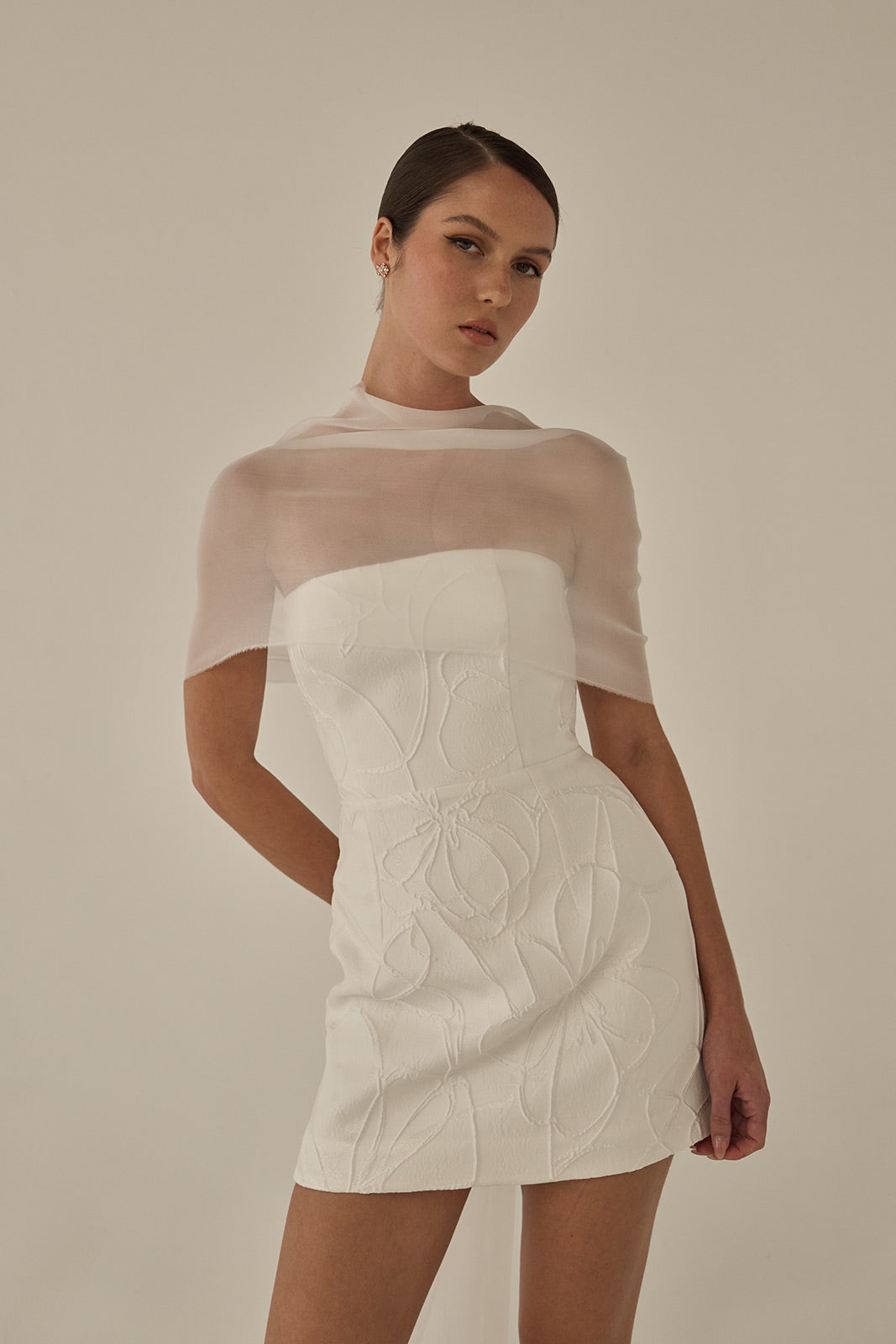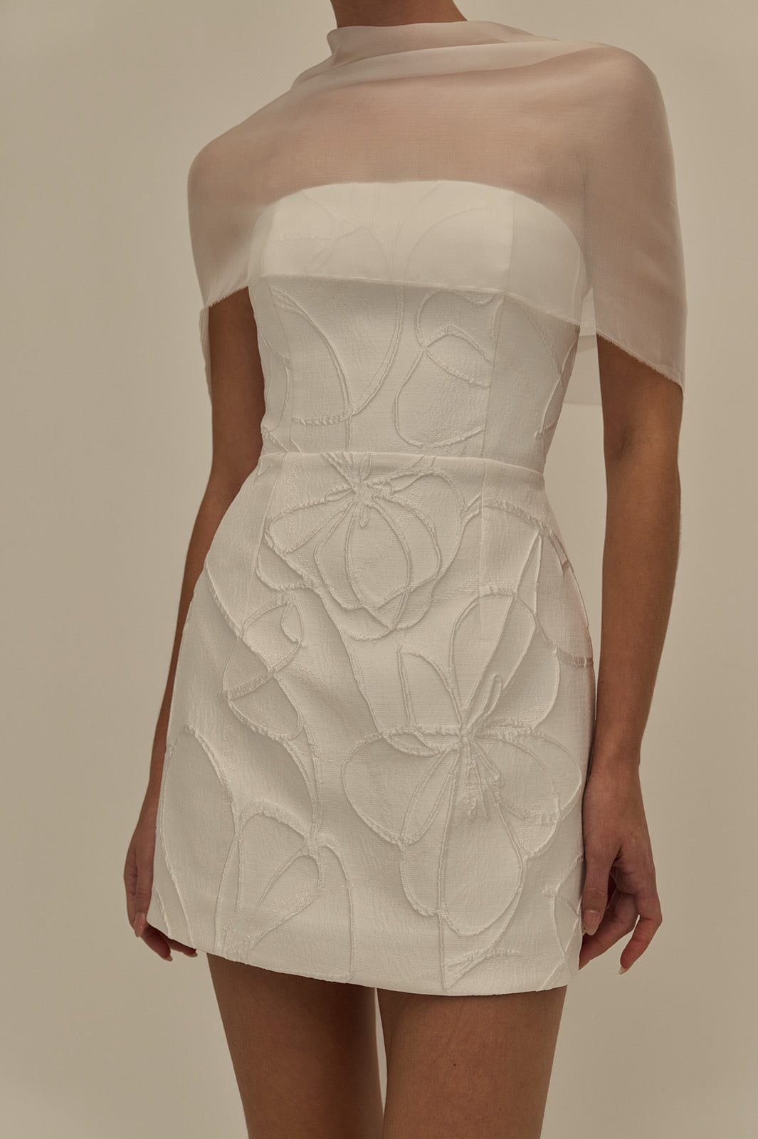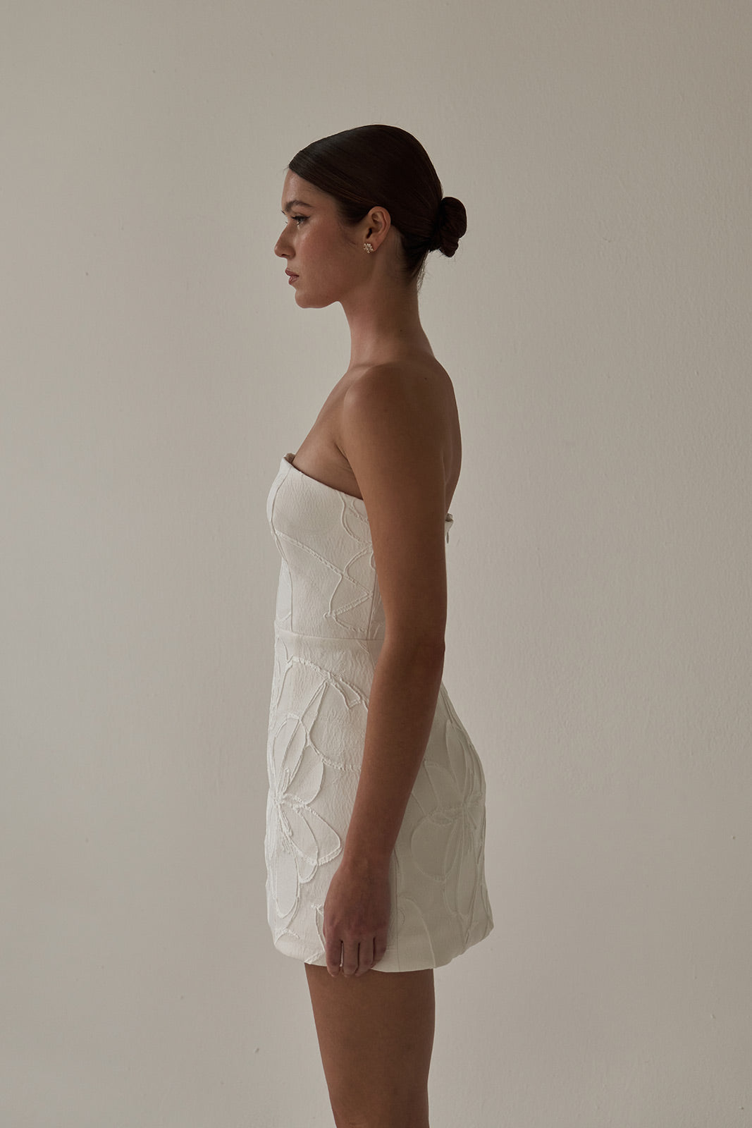 The Senna mini is a sleek, structured silhouette crafted from French brocade. Its strapless bodice features a clean straight neckline, paired with a minimal straight skirt that highlights the fabric’s sculptural texture. Refined and modern, Senna delivers effortless impact in a compact, elevated form.
