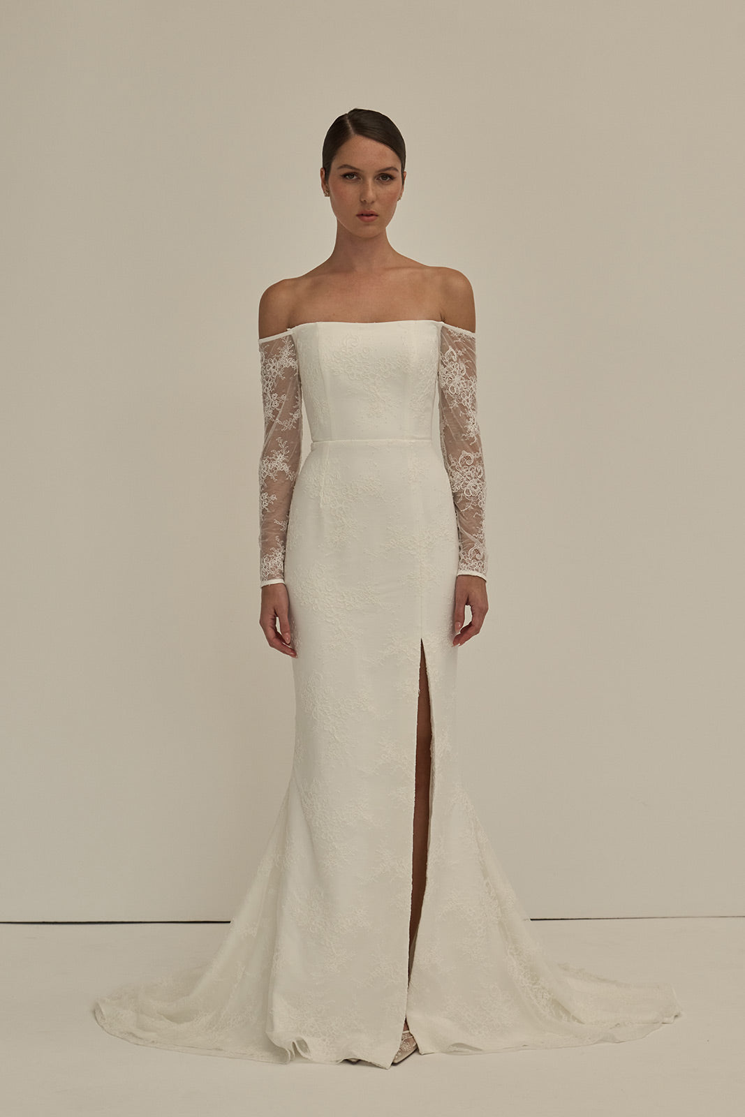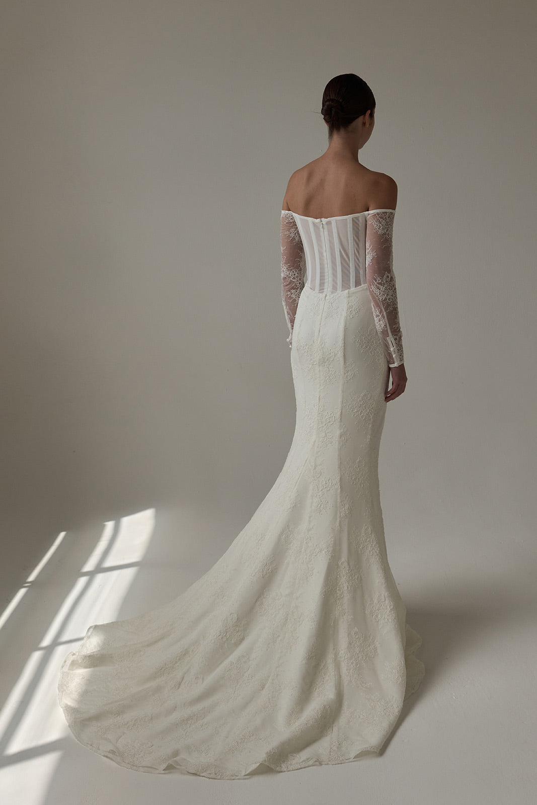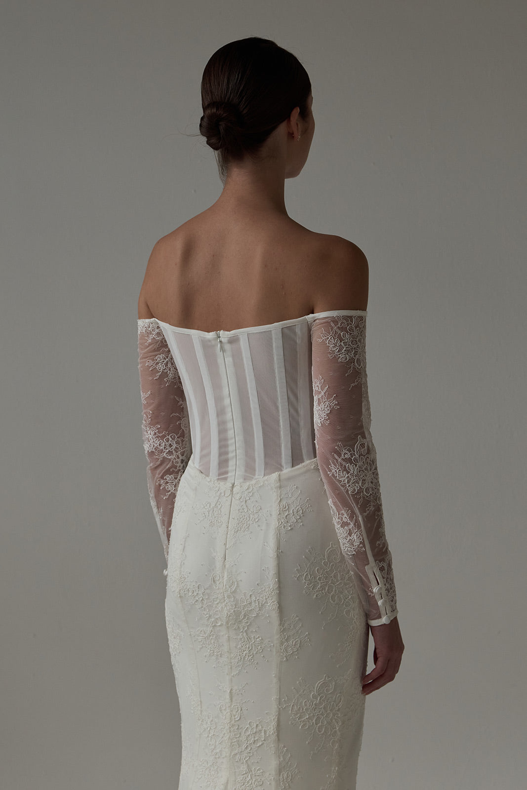 The Violet gown is a modern lace silhouette that balances delicacy with structure. Crafted from corded lace, it features sheer off-the-shoulder long sleeves and a fit-and-flat skirt finished with a front side slit. The back reveals exposed boning framed by sheer powermesh, creating a striking contrast of softness and architectural detail.
