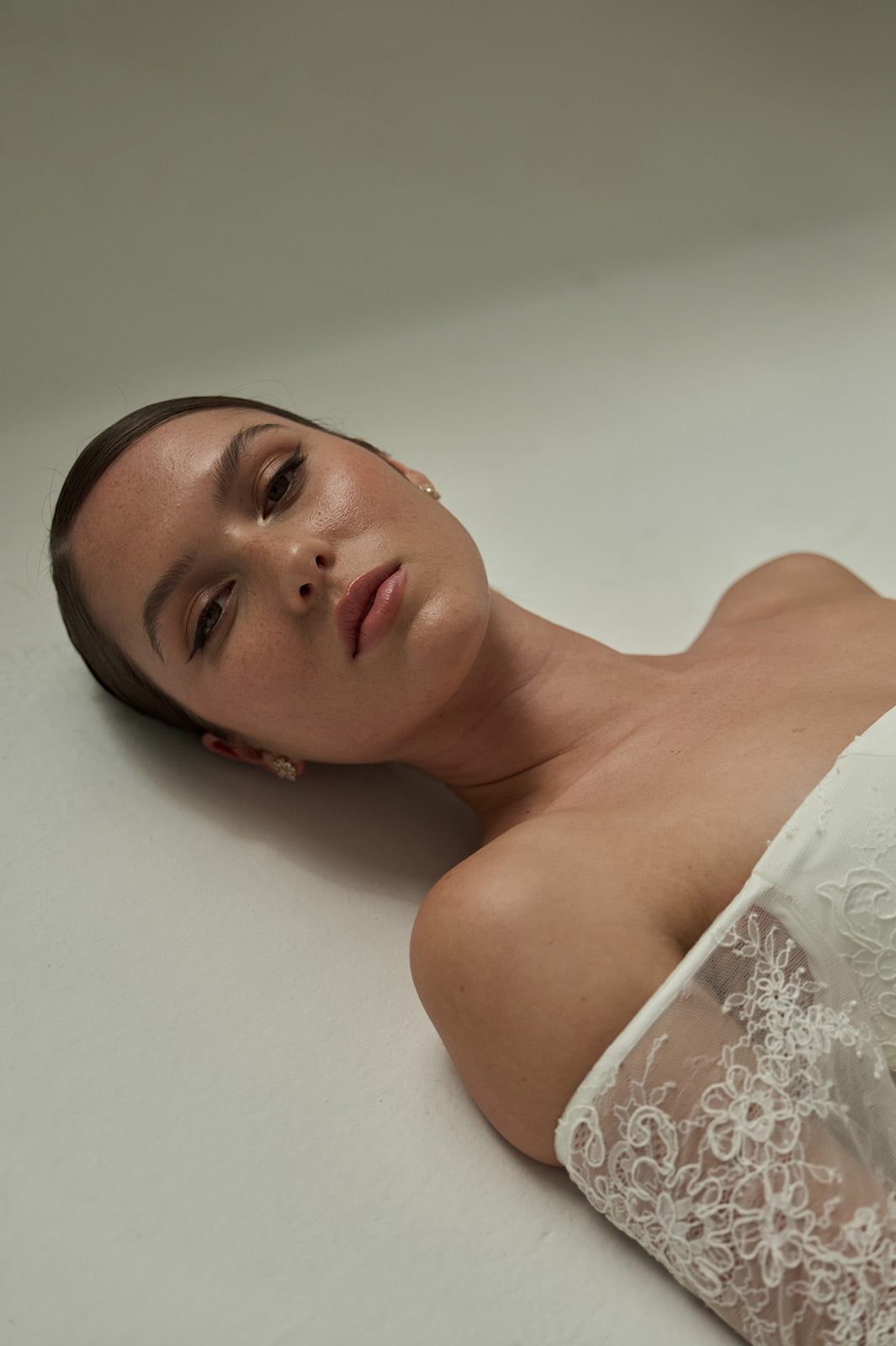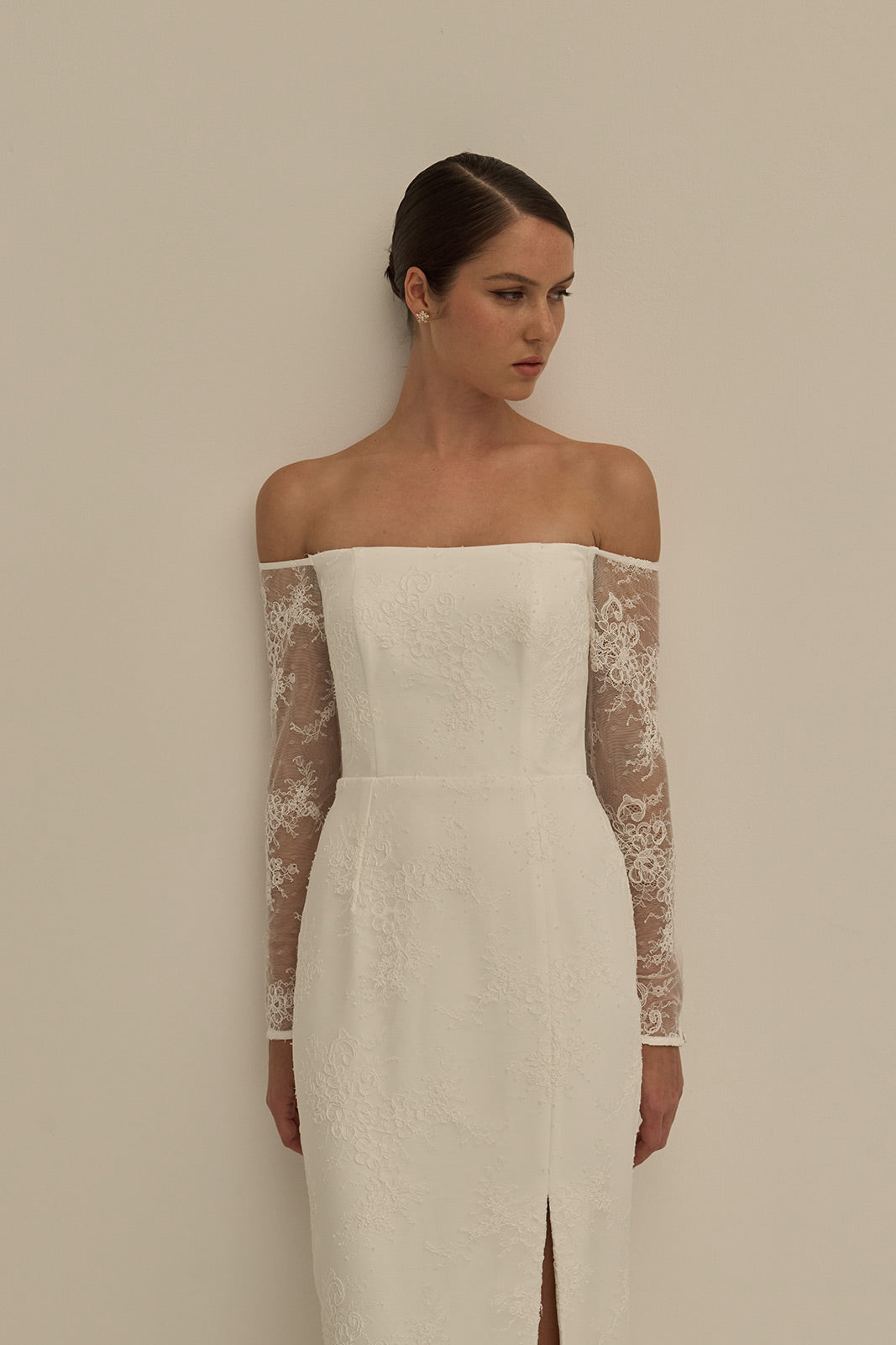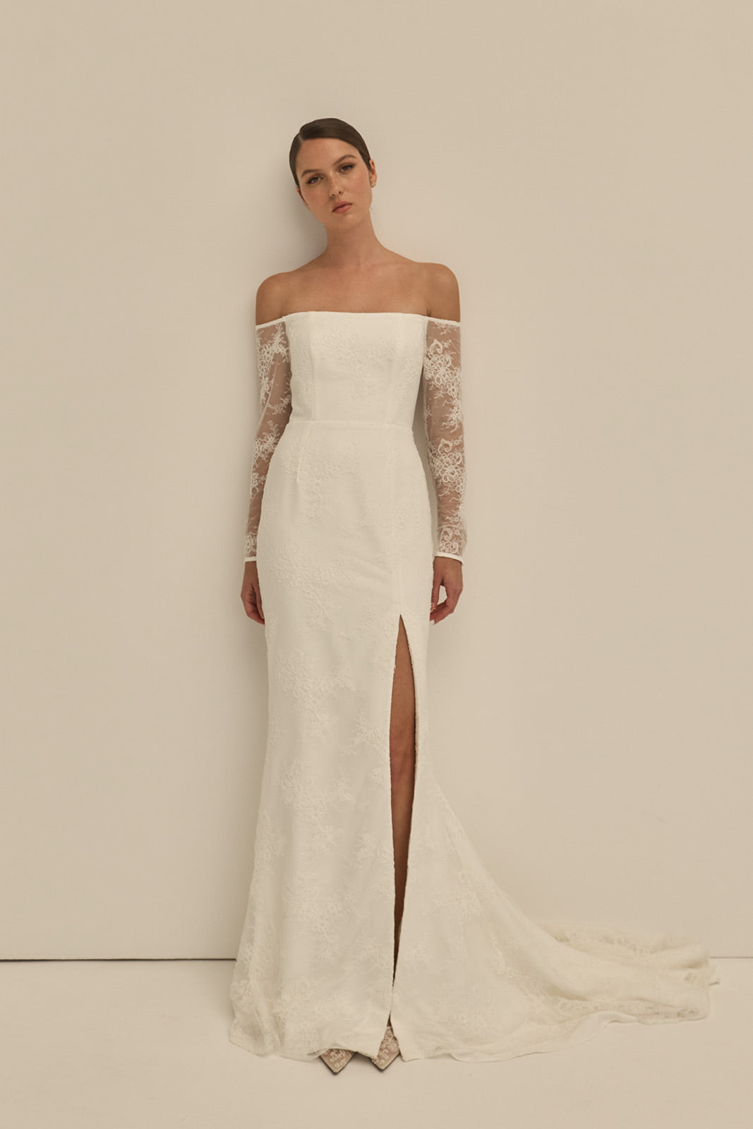 The Violet gown is a modern lace silhouette that balances delicacy with structure. Crafted from corded lace, it features sheer off-the-shoulder long sleeves and a fit-and-flat skirt finished with a front side slit. The back reveals exposed boning framed by sheer powermesh, creating a striking contrast of softness and architectural detail.